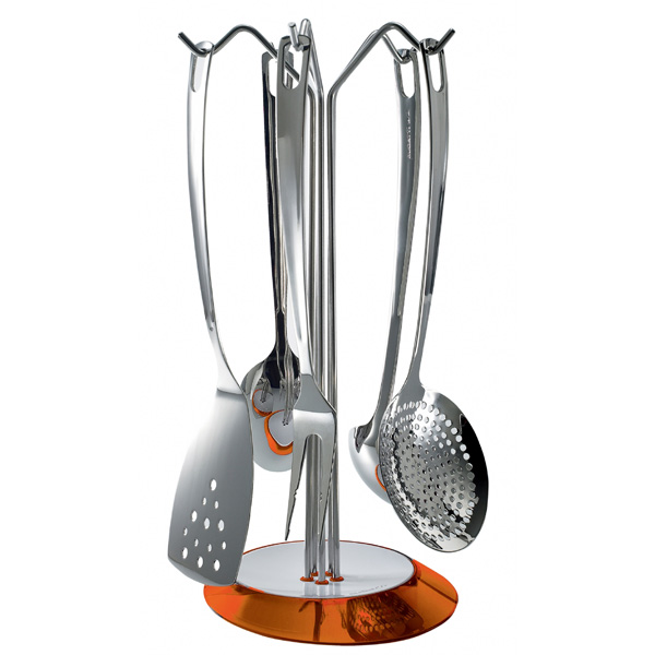 Набор кухонного инвентаря на подставке Bugatti серии Glamour превосходно будет смотреться на вашей кухне. Материал инвентаря и основной части подставки – нержавеющая сталь высокого качества с зеркальной полировкой, а основание подставки выполнено из пластика. Набор включает в себя 5 основных кухонных принадлежностей: разливная ложка, многофункциональная вилка с двумя острыми зубцами, лопатка для переворачивания, шумовка, многофункциональная ложка. Благодаря красочности всей линии Glamour, вы легко привнесете в свою жизнь целую радугу разноцветных изделий. Итальянская компания Bugatti предлагает своим клиентам только самые практичные, функциональные и качественные изделия, чтобы максимально облегчить процесс приготовления пищи.
