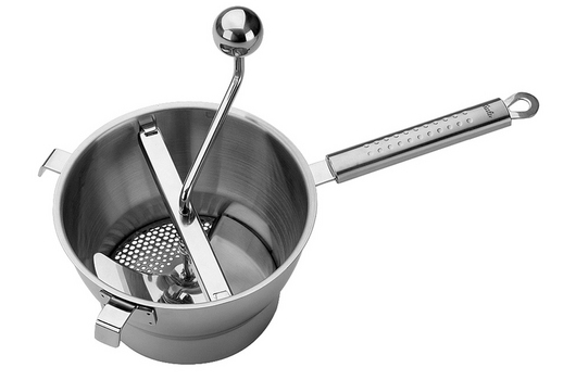 При помощи мельницы-овощерезки Вы сможете приготовить прекрасные крем-супы, джемы и пюре. Крепкая ручка и два крючка позволяют разместить овощерезку на кастрюле или миске. В комплект входят две вставки: мелкая и крупная.