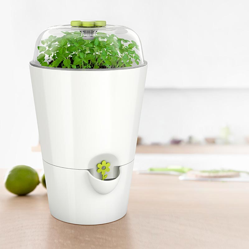 Декоративный цветок служит указателем уровня воды и подскажет, когда нужно будет осуществить полив в следующий раз. Приобрести этот товар можно вместе с универсальным набором для начинающих, включая семена базилика и грунт. Горшки для зелени являются устойчивыми к УФ-излучению и, соответственно, идеально подходят