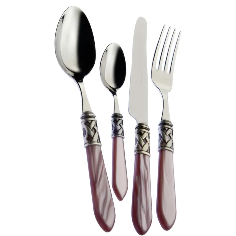 Набор включает в себя 24 предмета. Вилки, ложки и ножи из нержавеющей стали сделают ваш праздничный стол по-настоящему роскошным. Ручки приборов выполнены из акрила. Вставка из старрого-посеребреннога кольца придает особый шик каждому предмету.